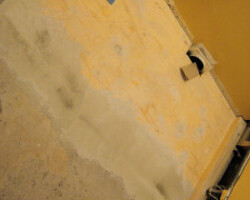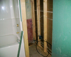 It looked like the taps had been leaking in the bathroom because the backboard had been cut out to make repairs. I intended to install a one-piece shower/bathtub unit so the cut-out around the taps wasn't really a factor, but I just wasn''t comfortable just covering it up without making sure it didn't still leak. It did, so we started pulling off the plywood to find the source of the leak. Soon we were down to the sub floor and there was evidence that it was wet. To our considerable shock, when we went outside after running the taps there was water dripping on the external wall. There was also some evidence that the studs had been wet because there was blackening on the bottom. It was becoming more obvious that this was not going to be a cosmetic fix and would require demolition and rebuild.