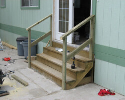In general the exterior of the house wasn't too bad, with most of the cladding in good shape. The one exception was at the entrance where they had put the BBQ too close to the vinyl siding and it had melted. I was most concerned about the first impression of the place so this is where I focused on making it look better. The first major job was to remove the old, broken patio door and replace it with the french doors, which made a huge first impression. Then we built the stairs and railings. Then we added a window to make the living room brighter. Then we re-clad this part of the place with new board and the horizontal boards in the highlight colour. Some new eaves-trough and downspouts and some flowers and things looked pretty good.