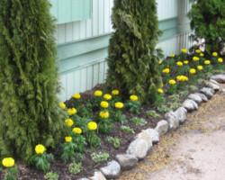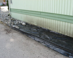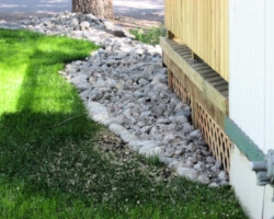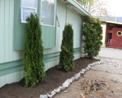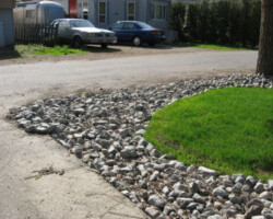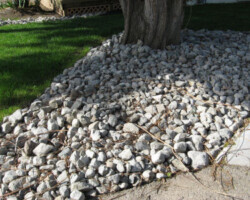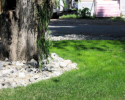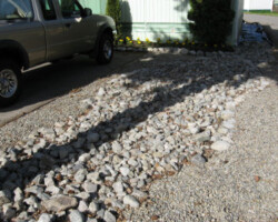I should also mention that there were a number of areas that it looked like it was going to be a problem growing grass. Some of the areas were also out of sight, like the side of the place along the road, so I wanted to make it as maintenance free as possible. I got the idea of creating what looked like a dry riverbed down the side and around the front. What I didn't realize at design time was just how many rocks this was going to take. I think the first full dump truck load was something like 20 yards and that's a whole lot of rocks. I figured that by the time I was finished doing the whole property I had moved and placed about fifteen thousand rocks in total. Yeah, grass might have been easier.